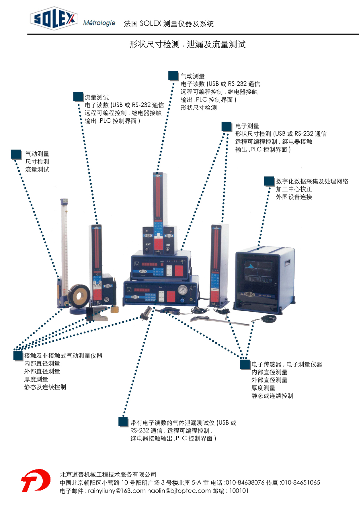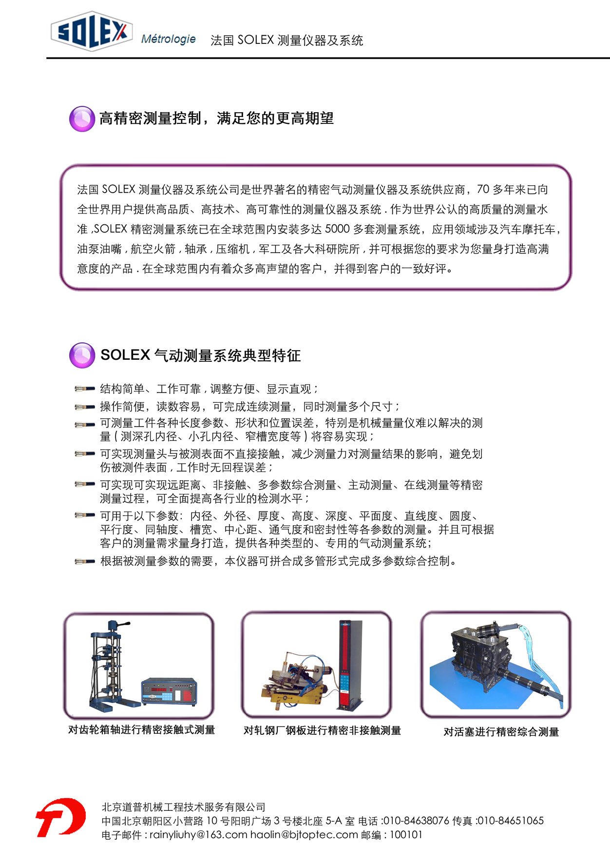 北京TOP成功建立法国SOLEX精密测量系统中国市场法国SOLEX测量仪器及系统公司是世界著名的精密气动测量仪器及系统供应商,70多年来已向全世界用户提供高品质、高技术、高可靠性的测量仪器及系统.作为世界公认的高质量的测量水准,SOLEX精密测量系统已在全球范围内安装多达5000多套测量系统,应用领域涉及汽车摩托车,油泵油嘴, 航空火箭, 轴承, 压缩机, 军工及各大科研院所, 并可根据您的要求为您量身打造高满意度的产品. 在全球范围内有着众多高声望的客户,并得到客户的一致好评。